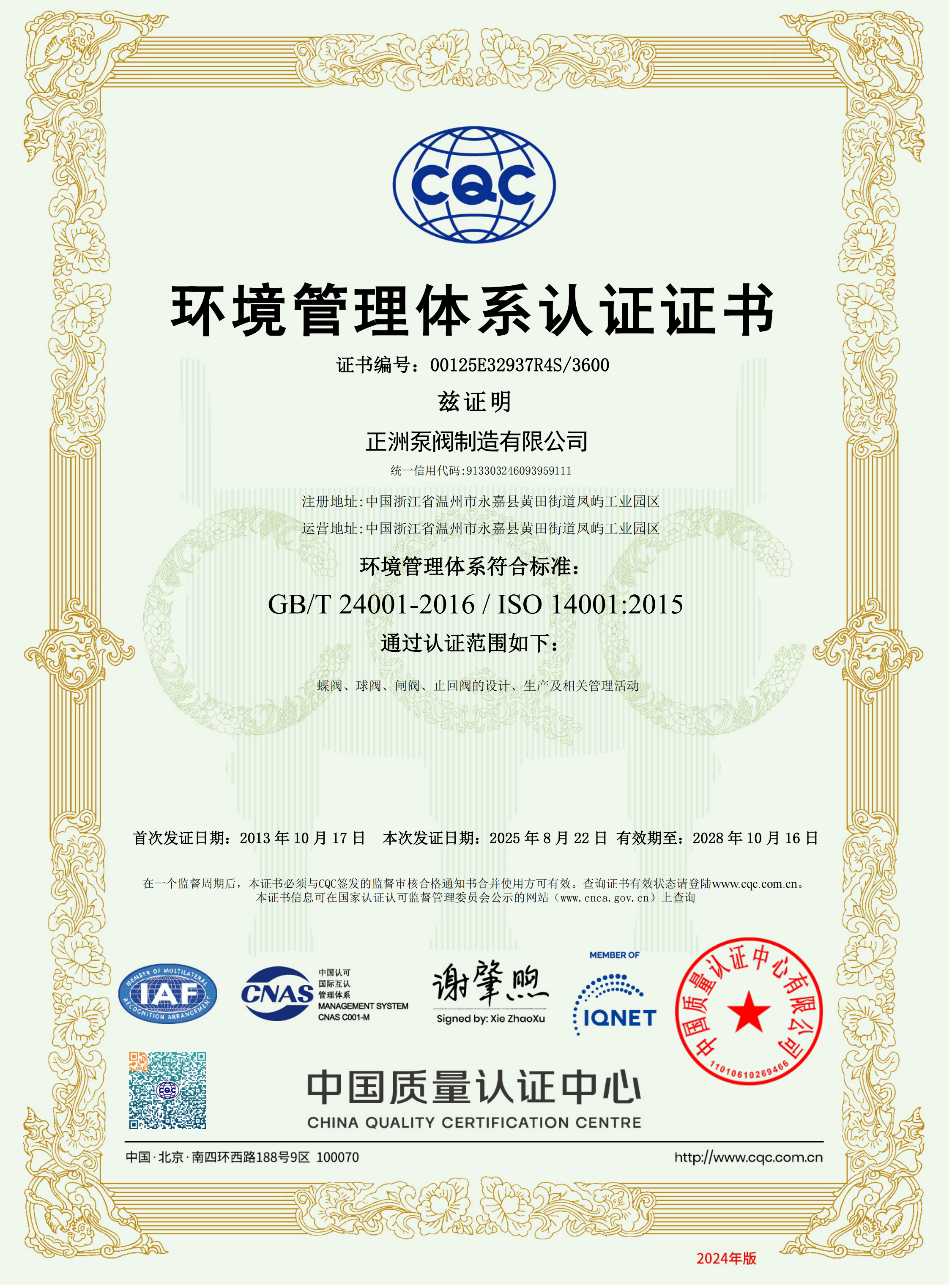 環(huán)境管理體系認(rèn)證證書